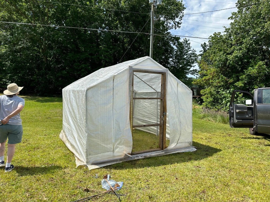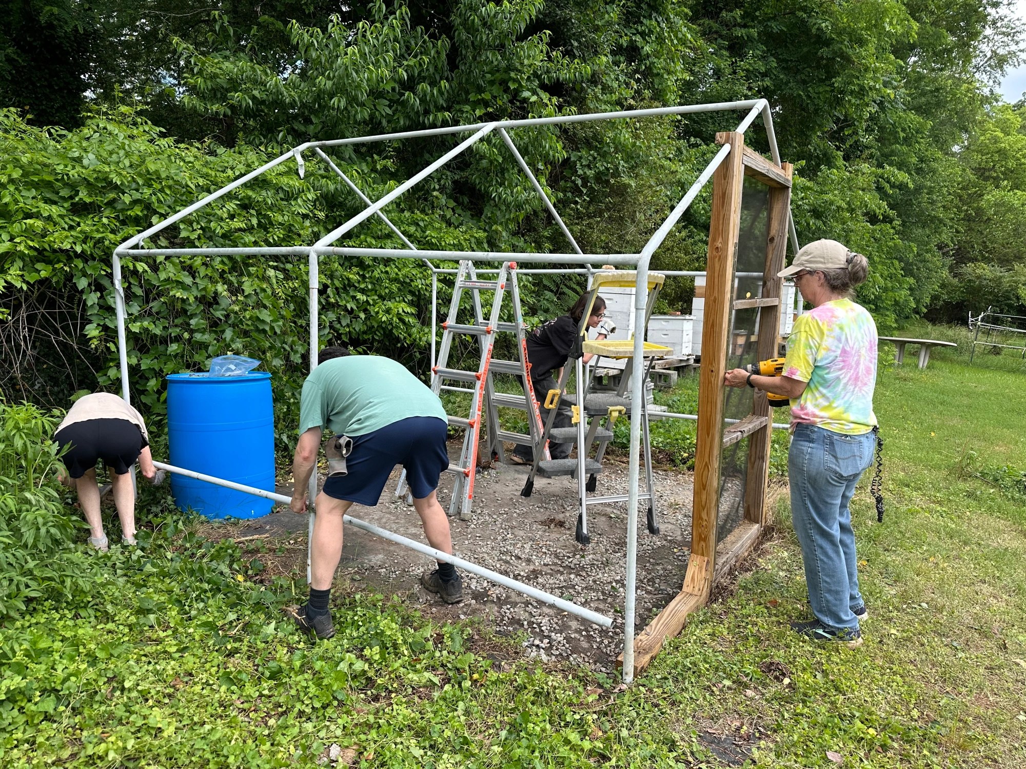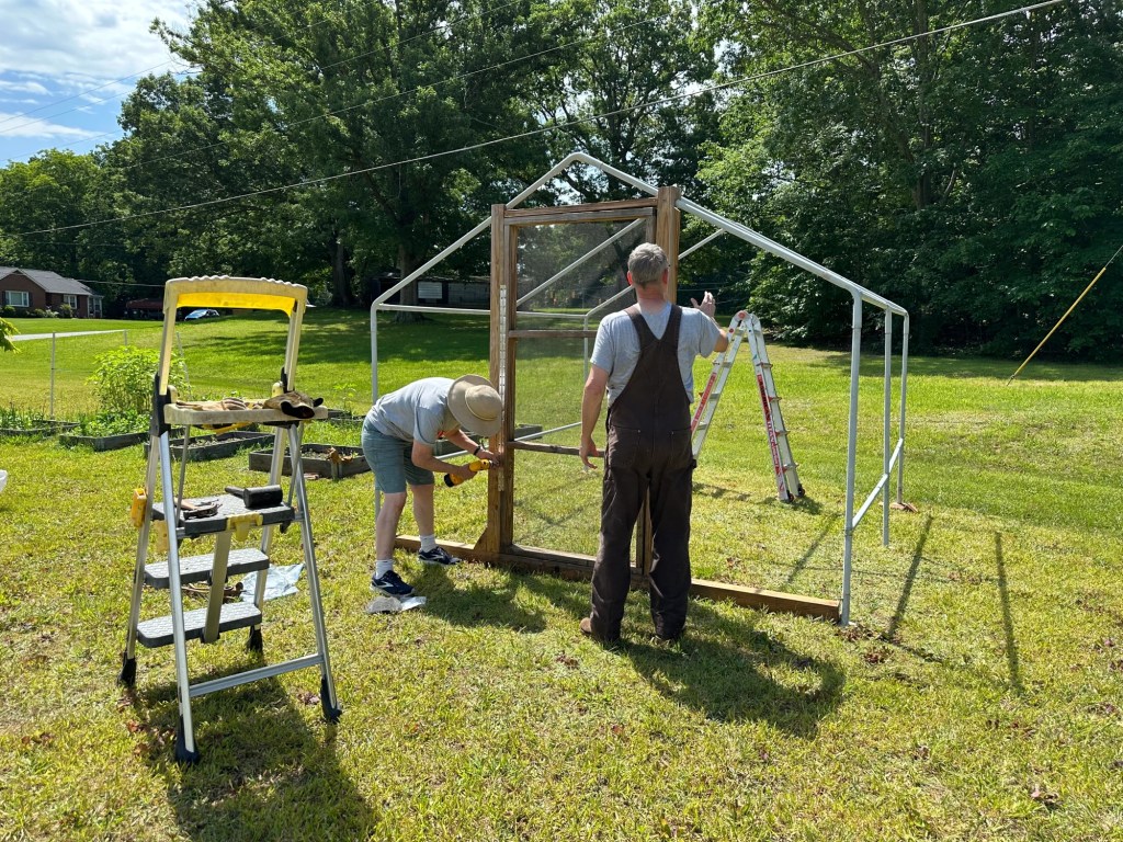 Old Richmond Grange member, Eileen, has donated this wonderful little greenhouse to our community garden. Members gathered in her backyard for the dismantling, the transfer, and ultimately the re-installation next to our raised beds. Wondering what great seedlings we can start in this little hut!